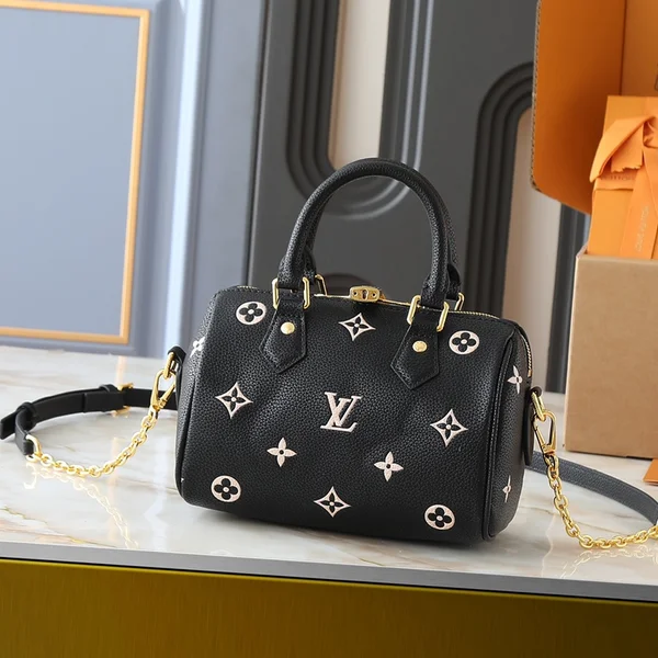 本款 Speedy Bandoulière 20 手袋焕新品牌经典 Monogram Empreinte 皮革以相同色调勾勒图案轮廓再以条纹内衬耀目挂锁和可拆卸链条丰富细节紧凑构型可容纳日常所需手提或斜挎皆宜尺寸205 x 135 x 120