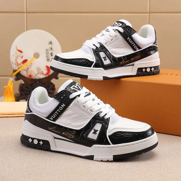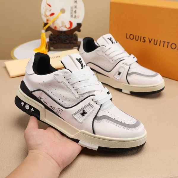 p190Virgil Abloh 以古着篮为蓝本创作 LV Trainer 粒面小牛舌呈现纯净色调设计师手写体路易威登标识压印一侧后部 54 标识追溯品牌诞生的 1854 年 粒面小牛皮橡胶外底外底饰有 Monogram 花卉 鞋舌和侧面饰有 LV 字母后部饰有 54 标识 侧面饰有手写体路易威登标识码数38444546可定做